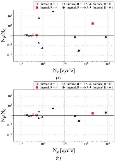 where is the predicted fatigue life, and are the material constants derived from the diagram in Figure 12. To evaluate the accuracy of the prediction, the ratio of the predicted fatigue life to the experimental fatigue life () was calculated. The closer this ratio is to 1, the better the accuracy of prediction obtained. Figure 13a,b show the prediction results using the total facet area and the major facet(s) area, respectively. The stress ratio had no significant effect on the fatigue properties.