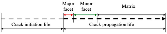 In general, fatigue life can be divided into the crack initiation life and crack propagation life. In facet-originated fractures, the crack initiation life represents the number of loading cycles before the first facet formation. The crack propagation life can be sub-divided into the facet formation life and the loading cycles consumed after the facet formation, respectively. Considering the two-step facet growth behavior, the schematic of the fatigue process in the β titanium alloy is shown in Figure 14. In Section 4.1., the experimental fatigue life was applied to derive the material constants (i.e., the crack initiation life and facet formation life were not considered in the calculation). Yoshinaka et al. conducted X-ray computed tomography (CT) to observe the internal fractures in an α + β titanium alloy Ti-6Al-4V. They reported that the crack initiation life varied from 20% to 80% of the total fatigue life, and that the first facet was formed instantaneously [33]. This indicates that the first facet formation life (i.e., fatigue life consumed by the major facet formation in the present study) is negligible. However, the crack initiation life should be considered for the estimation of the crack propagation rate. Therefore, in this section, we paid particular attention to the effect of the crack initiation life on the derivation process of the material constants based on the Tanaka–Akiniwa model.