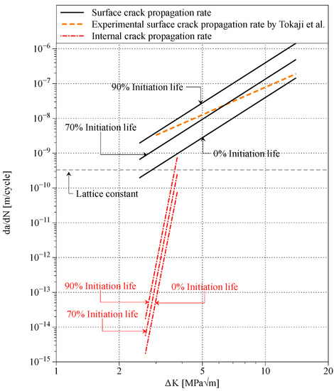 Furthermore, through X-ray CT observation of the internal fractures in Ti-6Al-4V, previous studies have reported that the propagation rate of internal cracks reached 10−14 m/cycles with two orders of variation at a lower ΔK region around 2–3 MPa√m [36,37]. According to Figure 15, the difference in the estimated crack propagation rate between the 90% and 0% initiation life was only one order of magnitude. Meanwhile, at a particular crack propagation rate, the deviation of the ΔK between 90% and 0% initiation life was merely less than 0.2 MPa√m. This indicates that the deviation of the crack propagation rate due to various crack initiation life has no significant effect on the internal fracture. Namely, the crack initiation life is negligible to estimate the da/dN-ΔK relation of internal cracks when the Tanaka–Akiniwa model is employed. Mathematically, the cliffy gradient in the da/dN-ΔK curve (i.e., a large value of the material constant ) of the internal fracture also represents the different significance of the crack initiation life on the surface and internal fractures. As a conclusion, the crack initiation life has a significant effect on the derivation of the material constants in the surface fracture regime. However, it has a relatively negligible effect in the internal fracture regime.