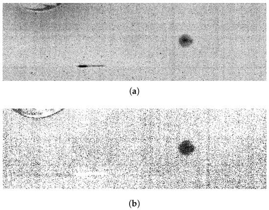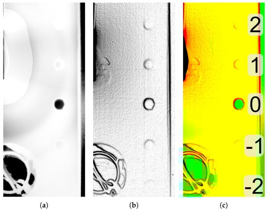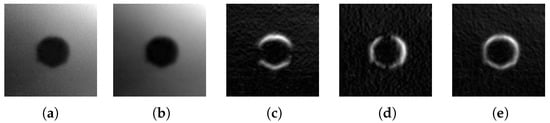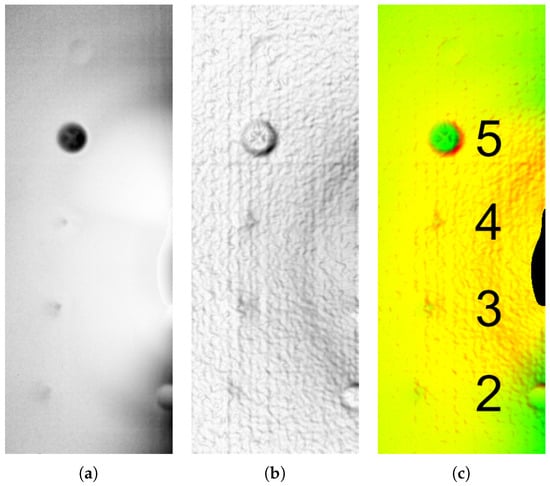 The IPHWT is also applied to area II and results are shown in Figure 6. Figure 6a,b show the result of the global covariance and local gradient method respectively and Figure 6c the composed image. All three images show the modified screw 5 as well as the tight screws 2–4. Additionally, a rivet at the left of the heating area indicated in black in Figure 6 bottom is visible. Another rivet at the right of the loose screw is only visible in the result of the global covariance method.