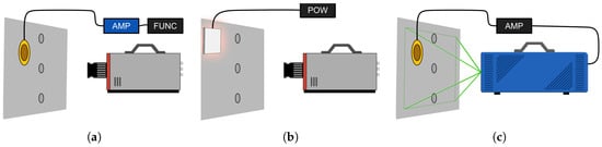 A sketch of the three different measurement setups. The setup of the Ultrasound Lock–In Thermography (ULT) (a), the setup of the In-plane Heatwave Thermography (IPHWT) (b) and the setup of the Scanning Laser Doppler Vibrometer (SLDV) measurements (c).