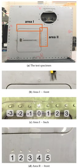 Two spots of the joint supporting frame and panel are intentionally damaged to test the proposed inspection methods. Figure 3b,c show a close-up of area I from the outer and inner side respectively. The middle rivet (“rivet 0”) in area I is hammered from the backside and turned with pliers until the gap between the rivet and the panel is sufficient to move it with the fingers. The neighboring rivets, rivet “−1 and “1”, are not intentionally damaged but have experienced some stress due to the modification of the surrounding region. Additionally, rivet “3” is turned with pliers to loosen the rivet slightly. Figure 3d shows area II with five screws. The nut of the screw “5” is loosened and the screw is slightly hammered (one soft hit) from the back. As visible in Figure 3d, this results in a small gap between the screw and the panel which is visible due to the lifting of the screw. However, the screw is still tight and it is impossible to move or shake it.