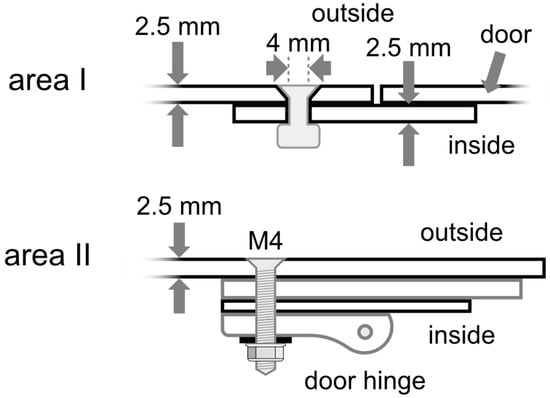 Figure 4 shows a sketch of the cross-section of area I and II. Both, the outer skin and the supporting frame have a thickness of . The supporting frame and the panel are riveted with countersunk aluminium rivets and the hinges are joined with countersunk screws and a screw nut from the inside as depicted in Figure 4.