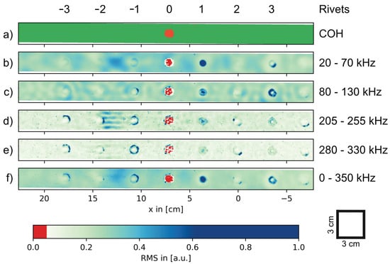 As described in Section 3.2, the analysis of the SLDV data results in one image that depends on the frequency filtering of the calculated FFT for each point. Figure 7a shows the map of coherence of each measurement point with the input signal where a threshold of COH  separates the red and green points. Figure 7b–f shows the RMS of the FFT of area I in some representative frequency bands. A detailed discussion about the calculation of the coherence can be found in Reference []. Each image indicates different features to a different extent. The most dominant spot in all six images is rivet 0 that appears red in the coherence as well as in all frequency bands. This indicates the low coherence and low RMS of the loose rivet respectively. The other eight rivets are not visible in the coherence representation and are somehow visible in the different frequency bands. In the lowest frequency band, rivet 1 and 3 show resonances and are visible as blue spots corresponding indicating a high vibration amplitude. In Figure 7d, a stripe-like artifact between 10  to 15  can be seen. The high frequency band with frequencies from 280  to 330  also reveals the intact rivets.