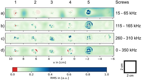 The vibration analysis of area II is shown in Figure 8. As stated above, the nut of the screw 5 is loose. However, the screw this still tight in the surrounding plate and no loose parts are visible from the front side. Hence, the analysis of the coherence does not show any features and is not shown here. This can also be conducted from the fact that no or only very small clustered red areas are visible in the frequency filtered RMS images which indicates a good coupling between the piezoelectric transducer patch and all points in this field of view. As in area I, the different frequency bands reveal different features that resonate at different frequencies. At 15  to 65 , screw 5 with the loose nut is visible. However, also the other screws, which built a tight connection between the two plates, are visible due to the bright areas around them. As for the rivets, a second vibration mode of screw 5 can be seen at higher frequencies (115  to 165 ) where the outer edge and the cross slot in the screw head are visible. At high frequencies above 260 , all screws become visible and even a sixth feature, a rivet at the right of screw 5 shows some resonance and confirms the characteristic observed in area I.