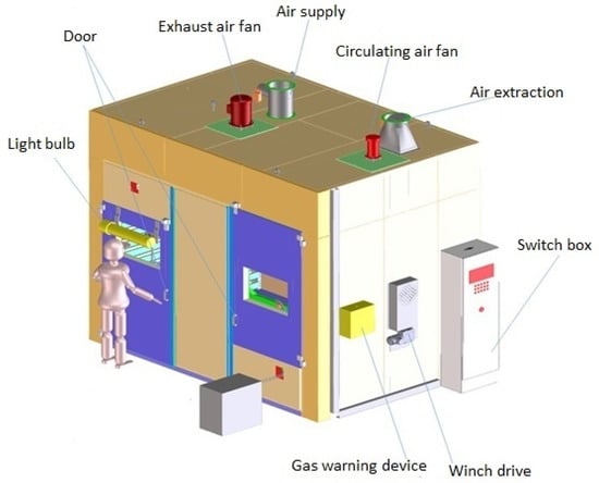 The winding dryer (Figure 2) on the right side has a gas warning device that forms an infrared gas transducer and a sampling system. Signal evaluation and eventual alarm reporting are performed in the central switch box. The concentration of solvents in the dryer is measured in an infrared gas transducer before the concentration exceeds the limit value, which is 35% lower explosive limit (LEL) through the throttle valve, the volume of exhaust air is increased, and an alarm is triggered on the gas warning system. At a concentration higher than 25% of the LEL, the heating of the circulating air is switched off, and the drive motor reels and a warning signal is turned on. Individual gas samples are obtained from the utility space and subsequently pumped into the dryer.