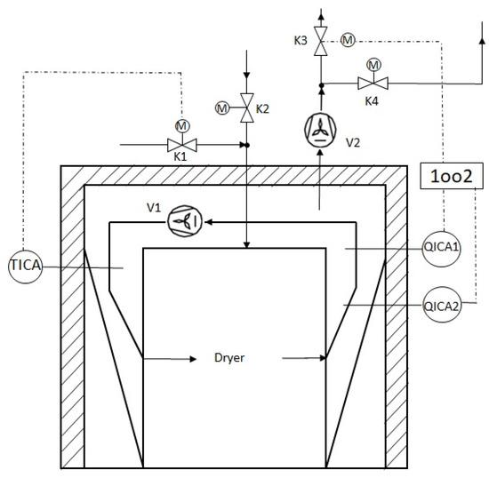 The tree of failure method is a hardware malfunction evaluation method that represents a logical approach to identifying the failure of individual components along with general system failure [18,19,20]. The fault tree represents the logical structure of the system, but this model does not consider the aspect of system behavior over time. The fault tree uses a deductive method of analyzing events from the top level to the failure of individual components. Figure 5 shows a troubleshooter of a winding dryer control system that consists of elements operating sequentially and connected by the OR operator or elements operating in parallel and thus connected by the AND operator. The tree diagram of failures shows how the failure of individual elements in a certain sequence can lead to system failure in the case of an exploded technological process. Elements of the tree (Figure 5) V1, V2,…, K3, represented by rectangles, simulate the binary logical state (Ok, fault) of the elements of the functional diagram of the control system (Figure 3). The presented diagram allows you to check the logic of the process protection system.