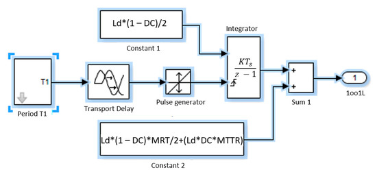 As mentioned above, the fault tree model does not take into account the temporal aspect of system behavior. Computational formulas in the standard are listed for the device check, where T1 is constant. Therefore, a dynamic mathematical model is proposed in which the failure interval is represented by the function . Figure 6 shows the design of the 1oo1 architecture model for the calculation of the instantaneous failure rate in the Simulink environment of the Matlab software. The given architecture assumes the use of one channel, and any dangerous failure leads to a breach of the safety function when a request for its execution arises. Subsequently, according to the calculations, it is possible to take into account the time parameter and its impact on the overall failure of the system.