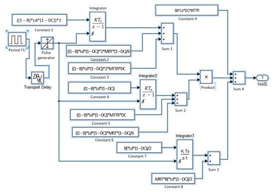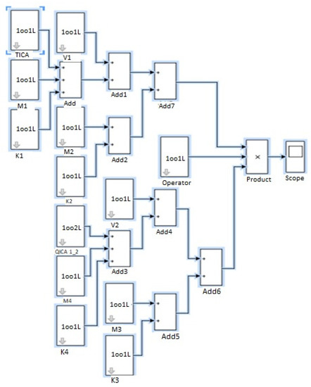 Other parameters in Table 2 represent values such as MRT (hours), which is the mean repair time (hours), MTTR the mean time to restoration (hour), DC is the diagnostic coverage (0%, 60%, 90%, 99%), β is the proportion of undetected faults that have a common cause (expressed as a fraction in equations and elsewhere in percent) 2%, 10%, 20% and β d are disorders that are detected by diagnostic tests and represent fractions that have a common cause (1%, 5%, 10%). Ld represents λd. The Simulink environment does not allow writing the letters of the Greek alphabet, so it is listed as Ld. The values of the probability of failures of individual elements of the structure were provided by the technologists of the production process based on a 15-year history of operation.