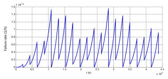 In modeling, the “fixed step” type with a numerical value of 1 is selected for the modeling step, which corresponds to a real one-hour time. Figure 10 shows an output timing diagram of the variation of the winding dryer failure rate over 5 years. The maximum failure rate reaches 1.58 × 10−4 1/h, corresponding to SIL1.