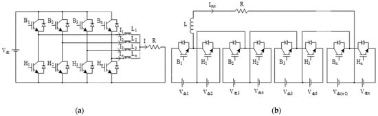 Figure 1 shows the configuration of such converter types. The switching-cells can be connected in parallel in a multiphase converter (Figure 1a) to increase its current output and to reduce the output current ripple [1,2] or in series in a multilevel converter (Figure 1b) to increase its voltage output and to obtain lower total harmonic distortion [3,4]. In case of large numbers of switching cells that need to be managed, the control system is the main issue of these converter topologies for applying the centralized control structure [8,9,10].