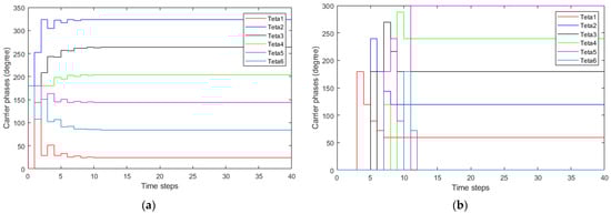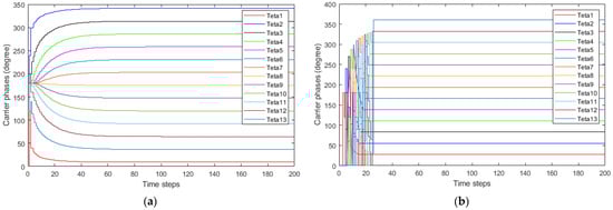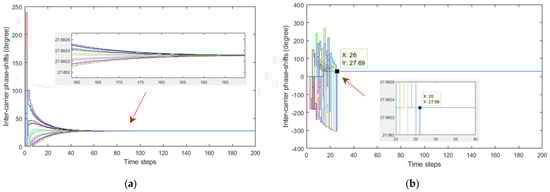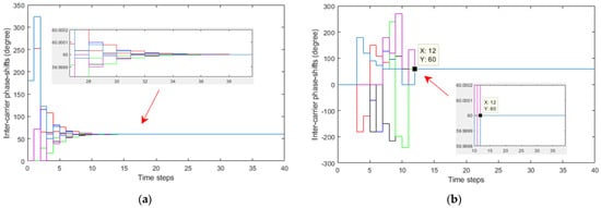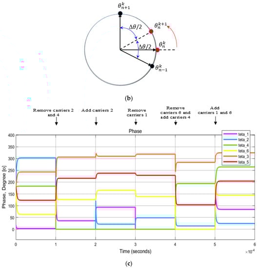 The restrictions of using the above updating rules are: (1) the system must have at least three carriers (N ≥ 3), and (2) at start up, one carrier must have a different angle from the others to ensure the proper operation of the algorithm. If the system is converged, the inter-carrier phase angle reaches the desired value after a number of iterations. In the case of the basic updating rule in (1), the number of iterations to achieve the convergence is given by the equation below [29]: