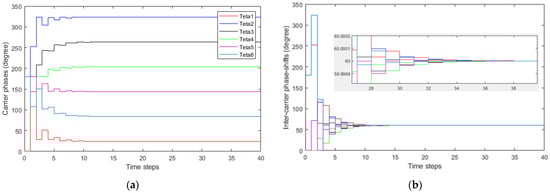 Analysis of convergence for a six-carriers system, (a) carrier phase; (b) inter-carrier phase-shift.
