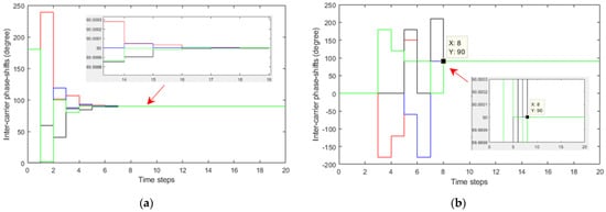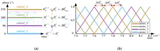 Figure 2a shows the conventional phase-shifted carrier (CPSC) generation scheme based on chaining cells of a multiphase converter (parallel structure). Each cell communicates with its two neighboring cells to exchange the information of carrier angles. Then, the carrier angle of each cell is self-corrected so that it can converge toward the expected interleaved state (Figure 2b). The basic updating rules are executed by using the Formula (1) [23]: