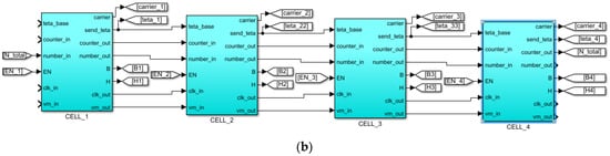Simulation model of the multiphase DC/DC converter (four phases), (a) topology; (b) connection between each cell controller.
