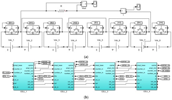 Simulation model of the multilevel DC/AC converter (five levels), (a) topology; (b) connection between each cell controller.
