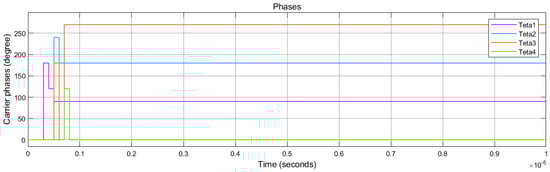 Figure 12 shows the simulation results of the proposed DSA-PSC principle for the multiphase converter with four carriers (see Figure 10a). It can be seen that the self-alignment process of the carriers with the inter-carrier phase-shift Δθbase = 90° is perfectly realized, and the steady-state can be reached very quickly (after eight time steps). Figure 13 shows the PWM control signal generation for the high-side switches of each cell.