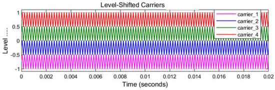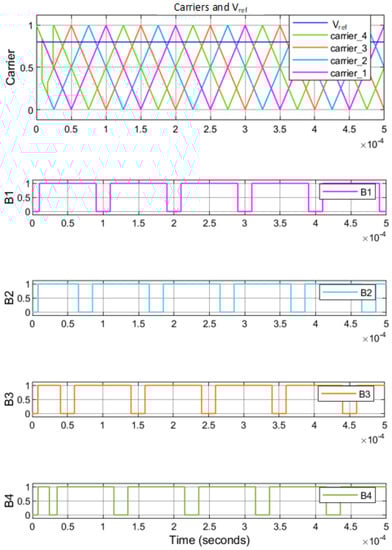 Figure 16 shows the simulation results of the proposed DSA-LSC principle for a five-level inverter which is controlled by four level-shifted carriers (see Figure 11a). The system carriers reach their final levels at steady-state quickly (i.e., without iterations) and correctly. The PWM signals at the gate of the high-side switches of the converter cells (B1 … B4) are shown in Figure 17. The output voltage and the output current waveforms are presented in Figure 18. It can be seen that the control system works properly with fast transient response.