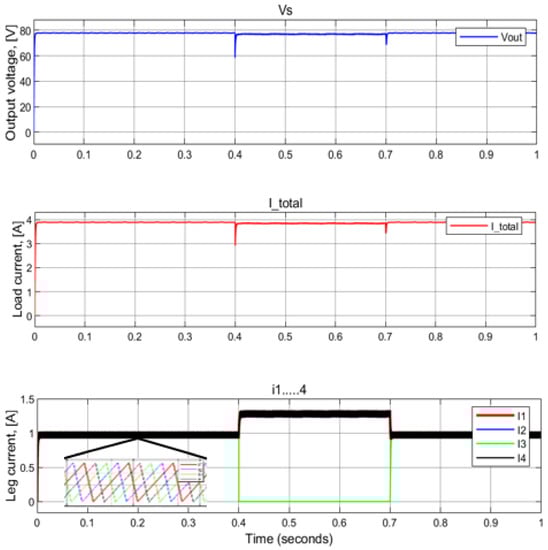 Figure 14 shows that the proposed control system works properly with fast transient responses on converter output voltages, load currents, and leg currents. In this figure, the system starts with four cells connected in series. At the time 0.4 s, cell 3 is removed, therefore, the current of leg 3 reduces to zero, and the converter output voltage fluctuates around 10% in about 1 ms before reaching steady-state. At time 0.7 s, cell 3 is restored, and leg 3 current quickly increases to the value 0.25Itotal after a transient time of 1 ms.