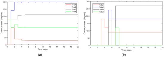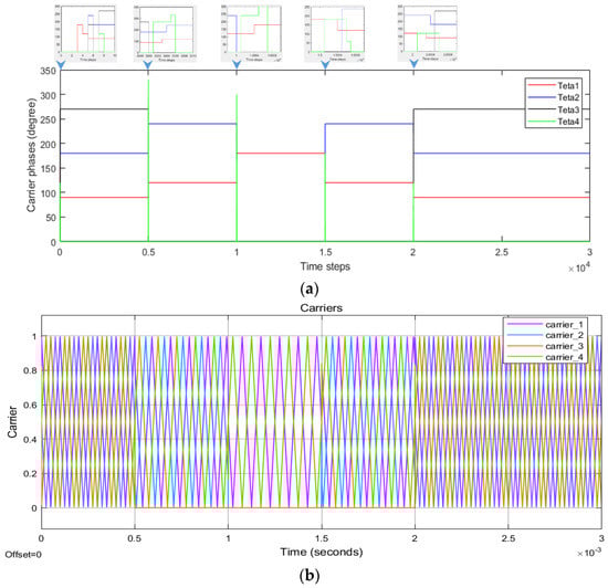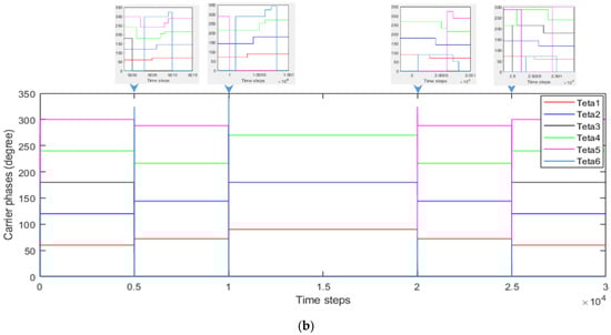 Multiple reconfigurations of four interleaved carriers using DSA-PSC method, (a) carrier phases; (b) phase-shifted carriers.