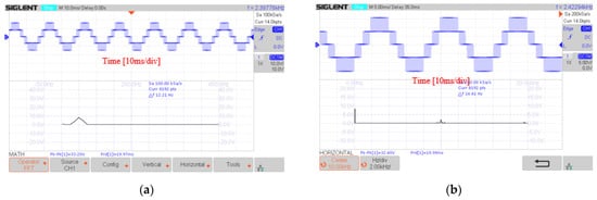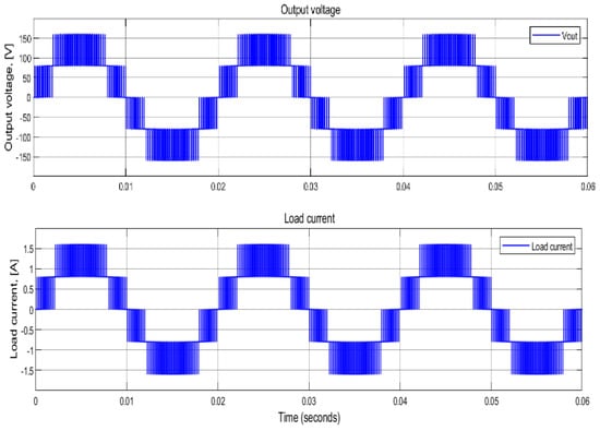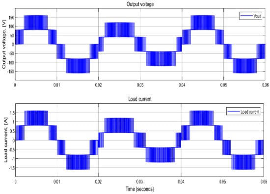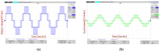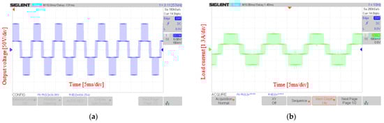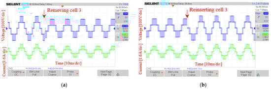 Figure 43 shows the output voltage and the load current of the converter when all four cells of the converter operate. In this case, the output voltage has five levels, as shown in Figure 43a. Figure 44 shows the output voltage and the load current waveforms when one cell is removed and the system has 3 cells left, resulting in four-level output voltage, as shown in Figure 44a.