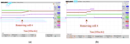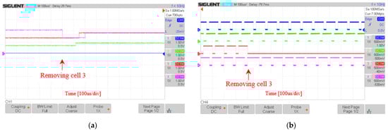 Output voltage and load current when removing and reinserting cell 3 using DSA-LSC method, (a) removing cell 3; (b) reinserting cell 3.