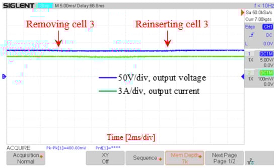 Figure 36 and Figure 37 show the output voltage and the current waveforms when removing and reinserting cell 3, respectively. These results show that the voltage presents a very low ripple. When the system is reconfigured (i.e., adding or removing a cell), the voltage fluctuation during the transient is about 1%, and the output voltage reaches steady-state within a very short transient time (as shown in Figure 36 and Figure 37).