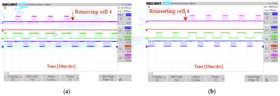 To validate the reconfiguration capability of the system in the case of removing or inserting a cell, Figure 19 demonstrates the process of reconfigurations for this four-carrier system. At the beginning, the system has four active cells with four perfect level-shifted carriers generated using the DSA-LSC method, as observed from time 0 to 0.02 s. Then, at time 0.02 s, the cell 3 is removed, and the system is reconfigured instantly with three level-shifted carriers. Finally, this cell is re-activated at time 0.04 s, and the system returns quickly to the original configuration with four properly level-shifted carriers.