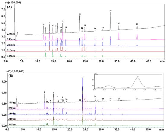 For efficient chromatographic separation of compounds 1–18, various parameters, such as make and type of column [SunFireTM (Waters, Milford, MA, USA), Gemini (Phenomenex, Torrance, CA, USA), Capcellpak UG120 (Shiseido, Tokyo, Japan), QuasarTM SPP (PerkinElmer, Shelton, CT, USA), and INNO (YoungJin Biochrom Co., Seongnam Korea)], acids (formic acid, trifluoroacetic acid, acetic acid, and phosphoric acid), and column temperatures (30, 35, 40, and 45 °C), were compared. Optimal analysis was achieved with a SunFire C18 column (4.6 × 250 mm, 5 μm), a column temperature of 40 °C, and two-component mobile phase system of distilled water–acetonitrile, both containing 0.1% (v/v) formic acid. Under the optimized HPLC conditions, compounds 1–18 were baseline separated with resolution values ≥3.85, with HPLC run-times within 45 min (Figure 1 and Table S3).