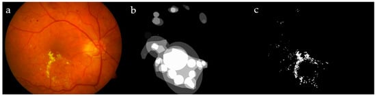 Ocular diseases have sparked remarkable interest because they are serious and influence a large portion of the population. An example of a relevant ocular disease is diabetic retinopathy (DR) [1], because it may cause blindness in working-age patients. DR is a progressive pathology that can change from mild to severe non-proliferative disease, and it is an important factor contributing to blindness. This disease affects up to 80% of those who have suffered from diabetes for 10 years or more [2]. Due to increases in life expectancy and other factors, the number of people affected by exudates is growing [3]. Exudates are one of the main symptoms of DR, caused by the leakage of proteins and lipids from damaged blood vessels in the retina. They can be recognized as yellow lesions distributed on the interior surface of the eye, with different sizes in different locations, according to the severity of the retinopathy (Figure 1a). From a practical point of view, it must be noted that DR does not show salient symptoms in the early stages [4]; therefore, it is a challenge to identify the disease early enough to give a better chance for successful treatment [5]. To diagnose and implement a treatment, screening checks are required that, at present, require professional clinicians. On the other hand, automated mass screening tasks are an active area of research with promising potential in the field of computer vision [3]. Other examples of artifacts that may appear in the retina include hemorrhage, the escape of blood from vessels that appears as red lesions, and different types of pus [2]. The World Diabetes Foundation estimates that more than 640 million people will suffer from diabetes by the year 2040 [6].