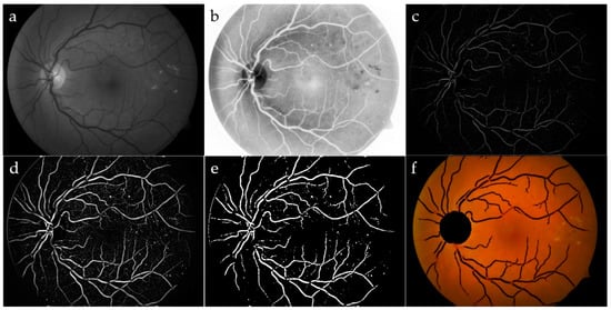 To refine the vessels, a top-hat filter was implemented by using a single-disk SE with radii from 5 to 15 pixels [20], producing an image containing the parts that were smaller than the SE and were darker than their surroundings. Blood vessels appeared as clear elongated objects, while the background was black, as shown in Figure 3c. An image with good contrast has sharp differences between black and white. Hence, contrast adjustment was implemented to remap image intensity values to the full display range of the data type. A preliminary segmented image was obtained again through a standard deviation thresholding algorithm, followed by a mathematical opening operator. The Erosion, as a part of opening operator, typically eliminates small bright objects, and the subsequent Dilation tends to restore the shape of the objects that remain, hence preserving the structures. The same label filter technique previously discussed was used in order to delete the remaining non-vessel structures of small sizes, where, in this case, any area containing less than 300 pixels was removed for each image. The final result for the blood vessel network after implementing the label filtering superimposed on the colored retinal image is shown in Figure 3f.