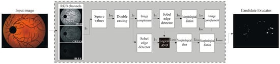 Our expert ophthalmologist who created the ground truth analyzed a set of random images from DIARETDB0 and DIARETDB1 that highlighted DR. The method faces a lot of challenges: the retina color varies according to skin pigmentation and iris color [12,21], exudate lesions may appear blurrier in some locations as intra/inter variation in an image/images [22], and the spherical shape of the eye reflects on both illumination and sharpness of the fundus image. Because the main information was present in the green channel, we applied the Otsu binarization algorithm [23] after a Sobel filter on this image channel that enhanced and then eliminated the optic disc and the vessels’ components present in the binary mask. Although the procedure described was simple and decidedly rapid, the resulting image, Iout, contained the expected exudates. This sequence of processing is depicted in a flowchart in Figure 5. These candidate exudates are not perfectly defined and still must be tuned. Figure 6 shows the detailed outputs of the sequence of the steps.