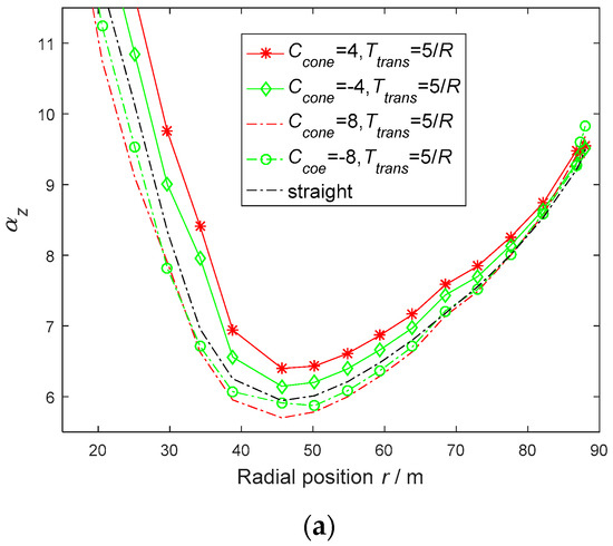 Utilizing the AAT AOA-extraction method introduced in Section 3.1.2, the αz and αn at different radial positions are compared in Figure 13. In the range of r > 2R/3, the αz and αn of C4S0 and C-4S0 nearly coincided with the straight baseline, which was consistent with the close Ft and Fz curves, as shown in Figure 11. This was because the three configurations were all without coning. What is more, C4 and C-4S1 had the same cone angle, which led to close αn distributions. Similarly, C-4 and C4S1 also had close αn distributions. In the range of R/3 < r < 2R/3, the four configurations, C4S2, C4, C4S0 and C4S1, had nearly parallel αn curves. The αn line of C4S2 was the highest, and C4, C4S0 and C4S1 had successively lower curves, which matched the successive decreases of the Ft and Fz curves in Figure 11. As discussed in Section 3.2.2, this was caused by the upstream movement of the tip positions, which made caused the blade sections to be further immersed into the wake, leading to decreases in αz and αn. In contrast, focusing on the group C-4S2, C-4, C-4S0, and C-4S1, the αn curves successively ascended with the downstream movement of the blade tips. In the range of r < R/3, C4S1 and C-4S1 had similar αz and αn distributions to the straight baseline. This was because the three configurations had the same blade tip position, although distinctly different cones appeared at r > R/3. Generally speaking, the αn distributions matched the force distributions in Figure 11. It is clear that the αn distributions can reveal the mechanism of force distributions on coned sections, even if the blades are coned into three parts. Additionally, correctly commutating αn is of vital importance for improving the traditional BEM method, although further discussion of this is beyond the scope of this paper.