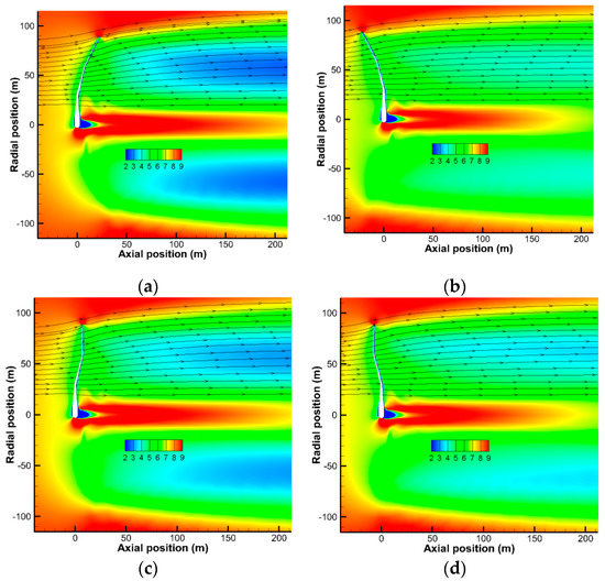 To understand the force characteristics presented in Section 3.2.2, further flow field analyses were carried out. Firstly, the streamline and the axial velocity contour in the YZ plane of C ± 4S2, C ± 4S0, and C ± 4S1 are shown in Figure 12. In the range of R/3 < r < 2R/3, the downwind cone C4S2 shown in Figure 12a had obviously lower velocity in the near wake region than that of C-4S2 shown in Figure 12b. This revealed that more energy was extracted by C4S2, which is consistent with the higher thrust force in Figure 11. Additionally, the downwind C4S2 had slightly larger wake expansion, which means a larger radial velocity. If the three figures on the left hand side are compared, the wake deficit is weaker and weaker when the blade tip is successively moving upstream from Figure 12a to Figure 12c,e. This means that the energy extracted by the rotor was progressively smaller, which is in agreement with the successive decline in the Ft and Fz curves in the range R/3 < r < 2R/3 in Figure 11. If the right hand side figures are compared, the wake deficit becomes stronger when the blade tip transforms downstream. This also confirms the successive increases in the Ft and Fz curves from C-4S2 to C-4S0 and then C-4S1. In the range r > 2R/3, the streamlines of C4S1 and C4S2 were the most and the least perpendicular streamlines w.r.t. to the blade, respectively, which led to the largest and smallest Fn. But, as shown in Equation (6), the large cone angle β reduces the value of Fz, which causes the Fz of C4S1 to barely surpass the baseline.