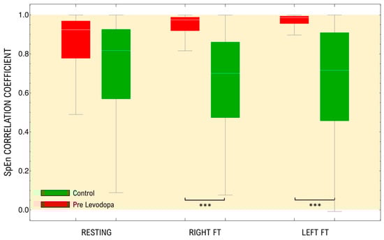 Our analysis shows that all the signals in the different categories seem to be strongly correlated (Figure 2). Moreover, there are no significant differences between the average correlation coefficient of spectral entropy among electrodes in the resting-state test for PD subjects compared to healthy controls (p = 0.09). Nevertheless, there are significant differences found in PD subjects in the motor activation test since there is an increase of the average correlation coefficient (right hand p < 0.001; left hand p < 0.001) and non-significant changes in healthy subjects (right hand p = 0.1; left hand p = 0.2).