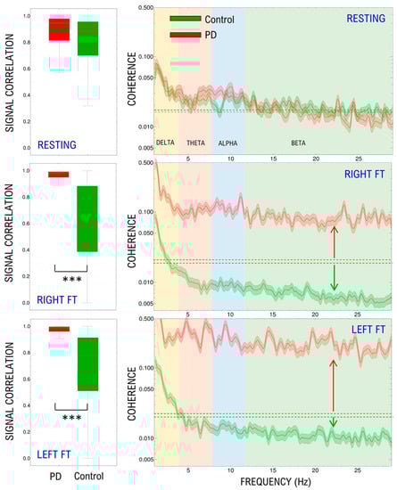 Figure 3 shows that electrodes are strongly coupled through low-frequency bands in both groups, especially in the delta band (1–4 Hz). There are no significant differences between control and patients in resting-state (p = 0.15). Motor activation causes a statistically significant generalized reduction of coherence in control subjects that is not different when both hands are compared (right hand p = 0.01; left hand p = 0.03) and a great statistically significant generalized increase in PD, also with no differences between hands (right hand p < 0.001; left hand p < 0.001).