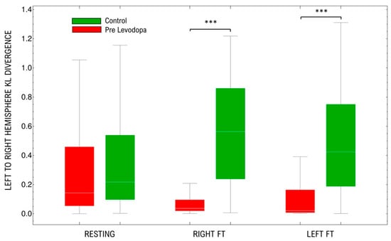 Distribution of Kullback–Leibler Divergences of the SpEn among electrodes in both hemispheres (left and right). Results are shown for the resting-state, right and left finger tapping. FT: Finger tapping. *** p < 0.001.
