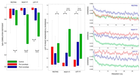 Comparison of the effect of levodopa over: Spectral Entropy Correlation Coefficient (left panel), Kullback–Leibler Divergence (central panel), and Median and SD of signal coherence (right panel). Results are shown for the resting-state, right and left finger tapping in each panel. * p < 0.05, *** p < 0.001.