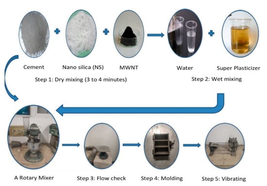 To ensure the integrity of the composite samples, the following fabrication procedures were carefully followed. Cement, NS, and MWNTs were weighed based on the specified proportions, and the mixture was poured into the bowl of an automatic mixer. Dry mixing was conducted for 3–4 min for preliminary mixing. After the pre-mixing, water and SP were added to the dry mixture and mixed again for another 2 min. A flow test was carried out to examine the fluidity, and the fresh mixture was decanted into molds with dimensions of 40 mm by 40 mm by 160 mm if the flow value was in the target flow range. The fresh mixtures in the molds were placed on a table-type vibrator and compacted for 60 s. The mixtures were subsequently cured in a storage cabinet under an ambient temperature of 18–20 °C for 28 days. Figure 1 shows images captured in each step of the fabrication procedure.