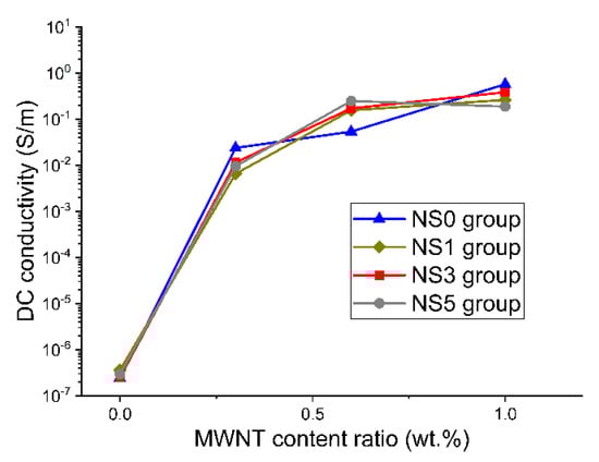 In the relationship of the MWNT content and electrical conductivity, the percolation threshold, which is the particular range of MWNT contents where a prominent increase in the conductivity occurred, was in the range of 0–0.3%. This percolation threshold range can be found in previous studies in which the electrical characteristics of the carbon-nanotube-added cement composites were explored [26,34]. The percolation threshold range and electrical conductivity levels in each group shown in Figure 2 showed marginal differences. Accordingly, it was inferred that NS, which was an electrically insulating material, did not produce adverse effects on the conductive MWNT networks.