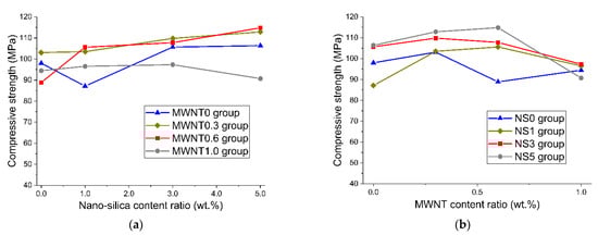 Compressive strength results of the MWNT/NS-incorporated cement composites after 28 days of curing: (a) NS content varied and (b) MWNT content varied.