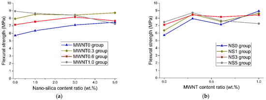 Flexural strength results of the MWNT/NS-incorporated cement composites after 28 days of curing: (a) NS content varied and (b) MWNT content varied.