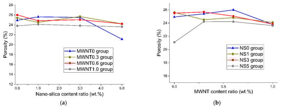 The porosity results of the MWNT/NS-incorporated cement composites: (a) NS content varied and (b) MWNT content varied.
