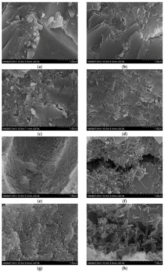 Figure 6a–p show the morphologies of the fractured surfaces of the MWNT/NS-incorporated cement composites observed by SEM. To provide the further morphological data, supplementary SEM images are presented in Figure S1. C-S-H, which is a flat and broad hydration product, was more visible when the NS content was greater [13,36]. In most of fractured surfaces, NS particles were not found, and this is likely due to that NS already underwent pozzolanic reactions. In the MWNT-incorporated composite types, most of MWNTs were not agglomerated and were distributed in a separated form. It was observed that diameter of MWNT was approximately 10 nm and length was several micrometers. In addition, it was found that the separated MWNTs were anchored in hydration products (e.g., Figure 6f–p) and MWNTs played the role of bridge (e.g., Figure 6f), which contributed to enhancements in mechanical strength. On the other hand, agglomerated MWNTs were detected in the C1.0N5 composite, which was prepared with relatively large amounts of MWNTs and NS. Unlike individual CNT strands, which led to bridging and packing effects in the cement hydrate or interface, the agglomerated CNTs did not yield these positive effects, but rather they acted similarly to pores in the microstructure of the cement composites [25,37].