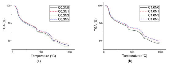 Figure 7a,b presents the TGA results obtained by recording the mass loss when the cement composites in the MWNT0.3 and MWNT1.0 groups were subjected to progressive heating from 31 °C to 998 °C. Mass losses primarily occurred within two temperature ranges. The first range was between 31 °C and 200 °C, where water molecules dehydrated from the calcium silicate hydrate gel [4,13,36,38]. Therefore, the mass loss in the first range signified the amount of C-S-H produced by cement hydration in the composite [4,13,36,38]. The second range was between 325 °C and 550 °C, where calcium hydroxide (also known as portlandite) decomposed, and the mass loss in this range represented the amount of CH produced as a result of cement hydration [4,13,36,38]. Since CH can undergo a pozzolanic reaction with NS, and the reaction results in the formation of additional C-S-H, the reduction of the CH mass loss shown in the MWNT0.3 group and MWNT1.0 group of Table 4 signified an increased amount of C-S-H [4,13,36,38].