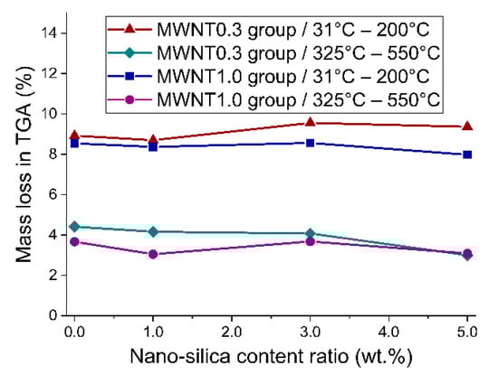 The mass losses computed from each composite in the first and second temperature ranges are presented in Table 4 and Figure 8. The mass loss in the first range increased with the increase in the NS content in the MWNT0.3 group, which indicated an increase in the amount of C-S-H due to the addition of NS. Meanwhile, a trend of the mass loss in the first range in the MWNT1.0 group was dissimilar to that obtained in the MWNT0.3 group. In the MWNT1.0 group, an increase in the mass loss with the increase in the NS content did not occur, which indicated that an increase in the C-S-H generation due to NS addition was not noticeable. When the amount of the incorporated-MWNT was relatively large, the structure of the cement composite was dense, and this hindered the contact between the CH and NS. This hindrance prevented the formation of additional C-S-H. This may have negatively affected the reinforcement effect of the NS on the mechanical properties due to the sluggish generation of C-S-H, which transports mechanical forces. This agrees with marginal changes of the porosity in the MWNT1.0 group and small changes or deterioration in the compressive and flexural strengths of the MWNT1.0 group shown in Figure 3a, Figure 4a, and Figure 5a, respectively.