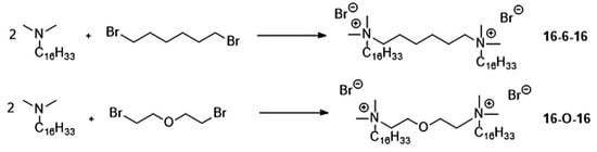 Gemini surfactants tested in this paper as capping agents for AgNPs were received by alkylation of N,N-dimethyl-N-hexadecylamine with 1,6-dibromohexane or bis(2-bromoethyl)ether, for 16-6-16, and 16-O-16 respectively (Figure 1). A synthetic procedure developed in our laboratory assumes carrying out the reaction without a solvent at room temperature [50,75]. These reactions proceed according to the nucleophilic substitution mechanism SN2. The rate of these reactions depends on the substrates concentrations. In case of the reaction without a solvent, the concentration of the reactants is the highest possible. Such reactions take place with high efficiency without waste. These reactions are in accordance with the greenolution approach, because they reduce the use of solvent to a minimum and minimize costs.