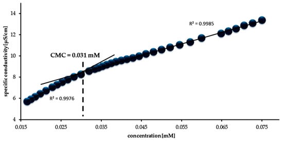 The CMC was determined using a conductometric titration, creating dependency graphs of the characteristic conductivity in water of the obtained compounds as a function of the concentration. This relationship generates two lines with different slopes. The straight line with higher inclination illustrates behavior before micellization, whereas the line with a smaller slope indicates the process of micellization (Figure 3). The intersection of lines formed as a result of linear regression defines CMC [50,59].