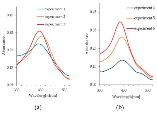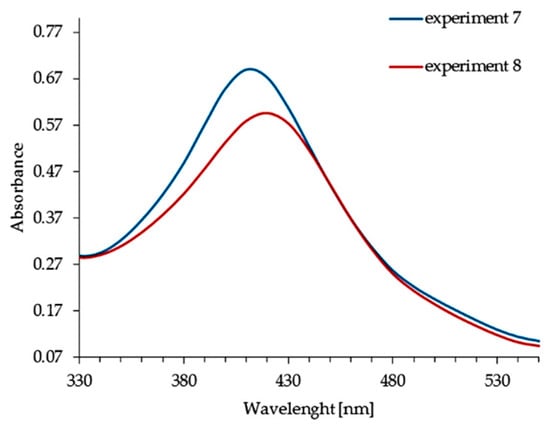 UV–Vis absorption spectra of AgNPs obtained in experiments 7 and 8 are shown in Figure 6. Strong absorption peaks at approximately 410 and 419 nm come from the surface plasmon absorption of nanosized silver particles. These spectra stand out; the good symmetric absorption peaks with a nearly unaltered width, suggesting that the size of the nanoparticles is very homogenous [89,92].