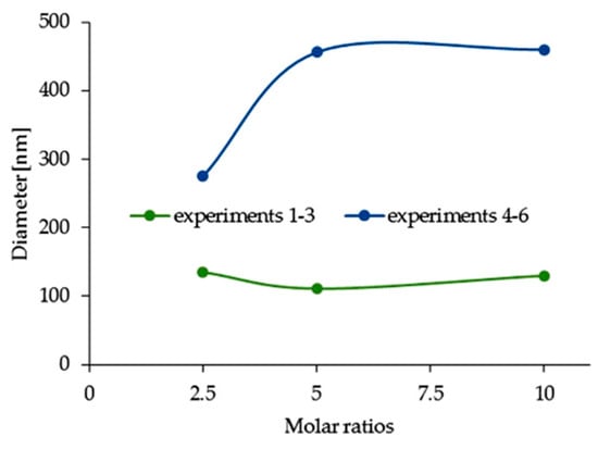 For experiments 4–6 we can observe, that with decreasing of 16-O-16 concentration the silver nanoparticles diameter size increase. However, in the case of 16-6-16 (experiments 1–3) the opposite trend is noticed—we monitor the almost constant diameter size in the range of all molar ratios. Construction of the spacer of gemini surfactants have a considerable impact on nanoparticles size. Compounds with more hydrophobic linker stabilizes more efficiently and gives smaller AgNPs than analog with spacer functionalized by ether group.